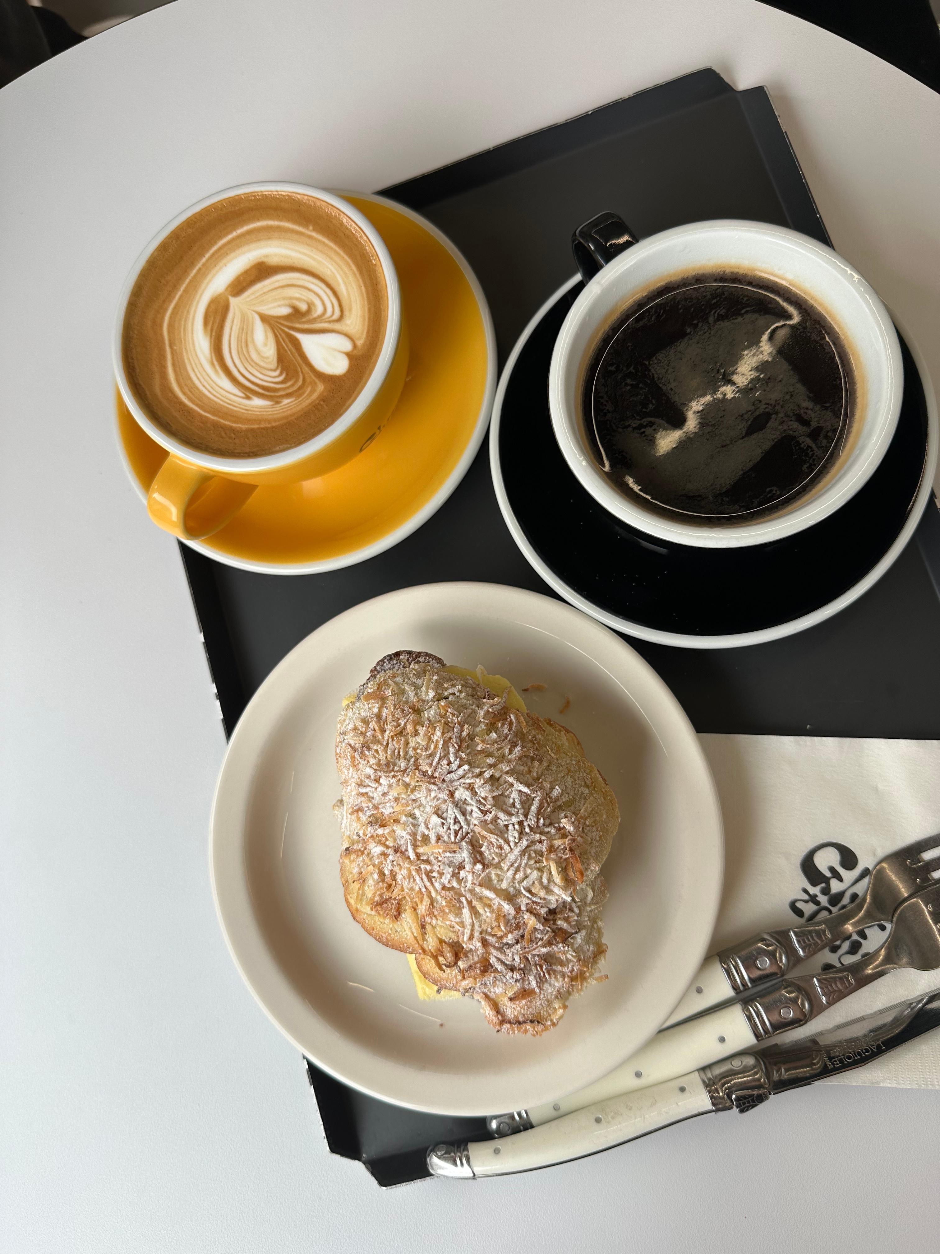 라떼와 아메리카노, 슈가파우더가 뿌려진 크로와상 샌드가 함께 놓인 글러트니커피 테이블 세팅 모습