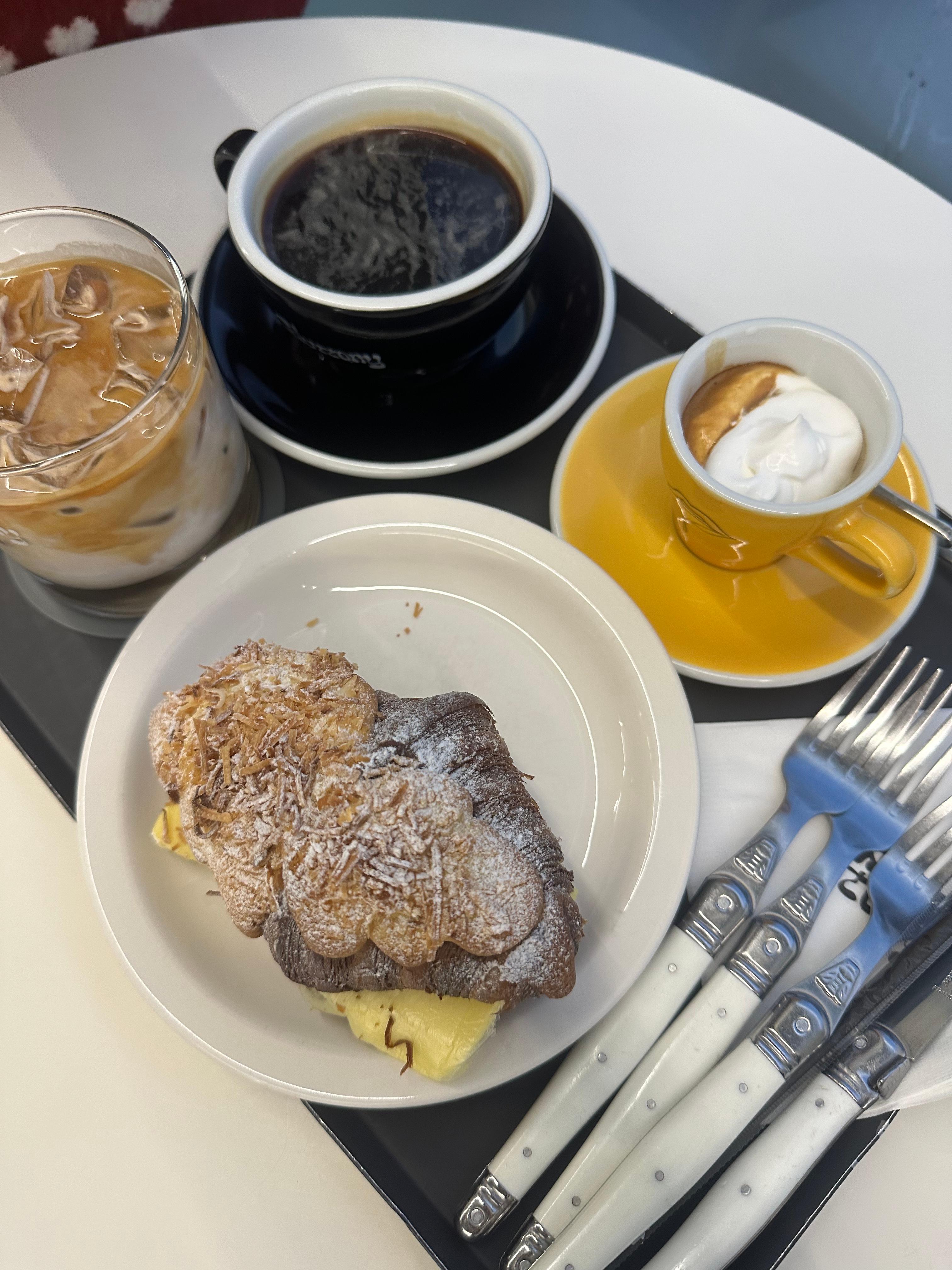 슈가파우더와 코코넛이 올라간 크로와상 샌드위치, 아메리카노, 아이스라떼, 크림 올라간 커피가 함께 놓인 글러트니커피 테이블 세팅 모습