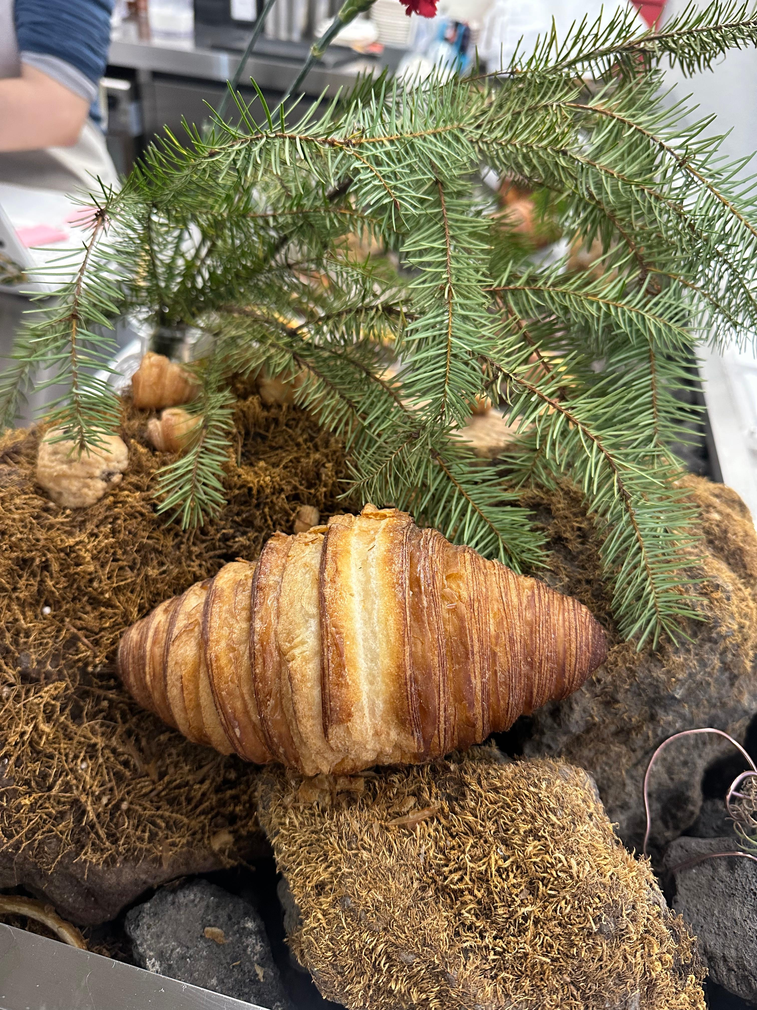 이끼와 소나무 가지로 꾸며진 제주 감성 디스플레이 위에 올려진 크로와상 베이커리 연출 모습