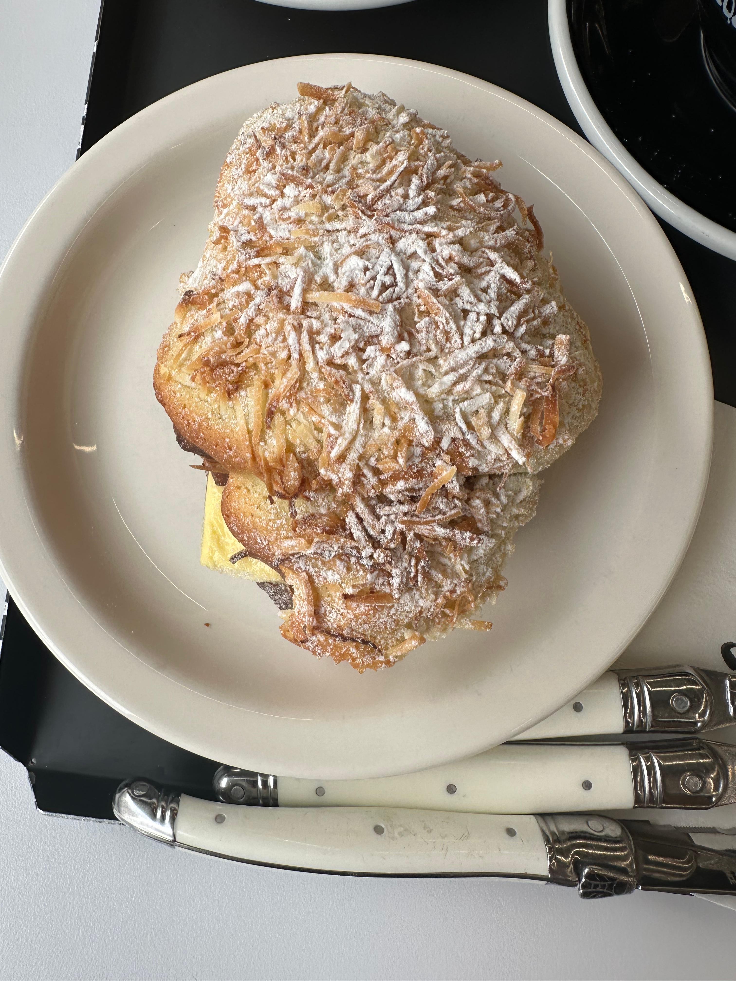 슈가파우더와 코코넛이 올라간 크로와상 샌드위치가 접시에 담긴 글러트니커피 디저트 메뉴 모습