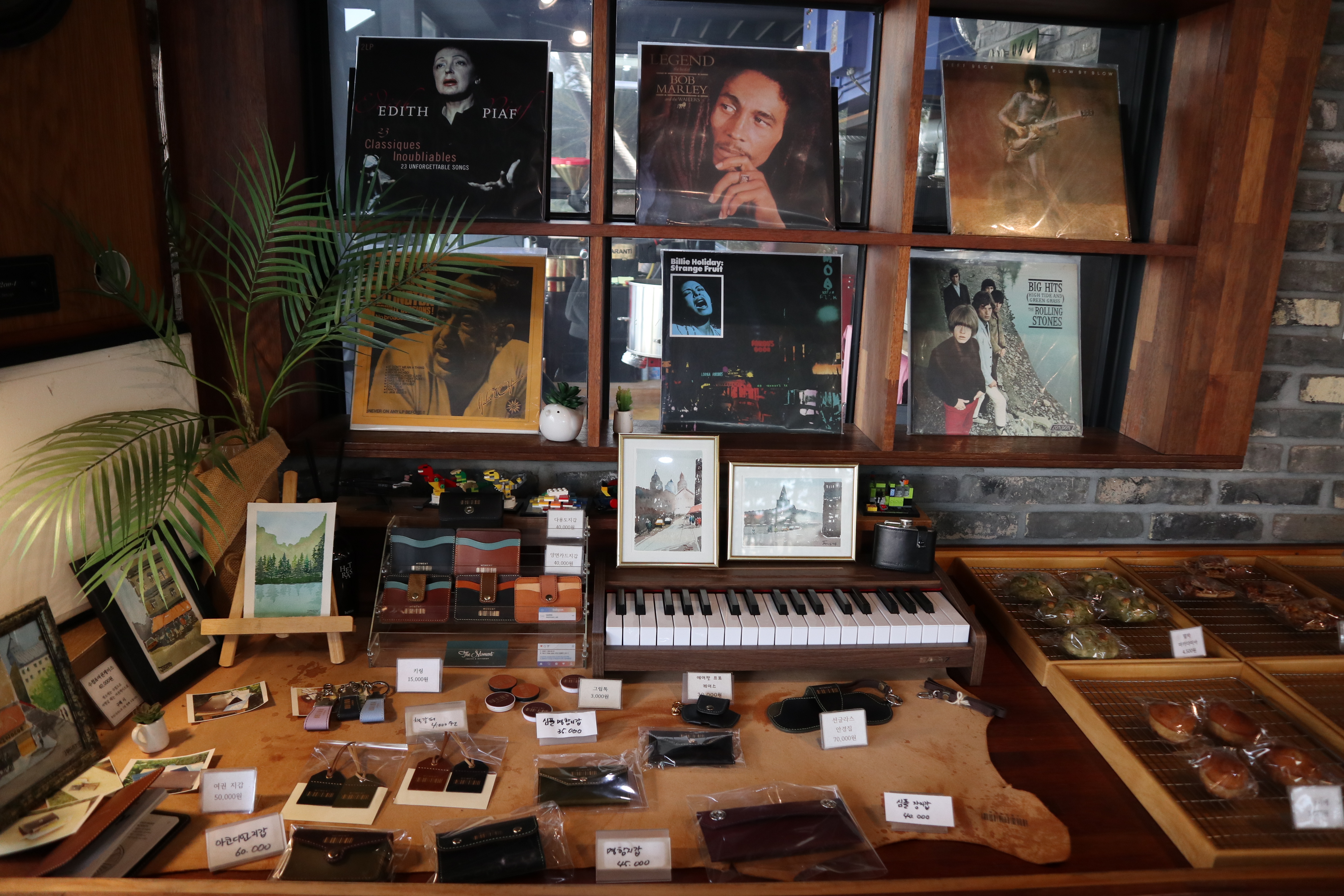 대형 프랜차이즈 카페는 아니지만 좌석 공간은 비교적 여유 있는 편입니다. 목재 인테리어와 벽면 진열 공간이 특징이며, 한쪽에는 원두와 커피 용품 판매 공간이 마련되어 있습니다.