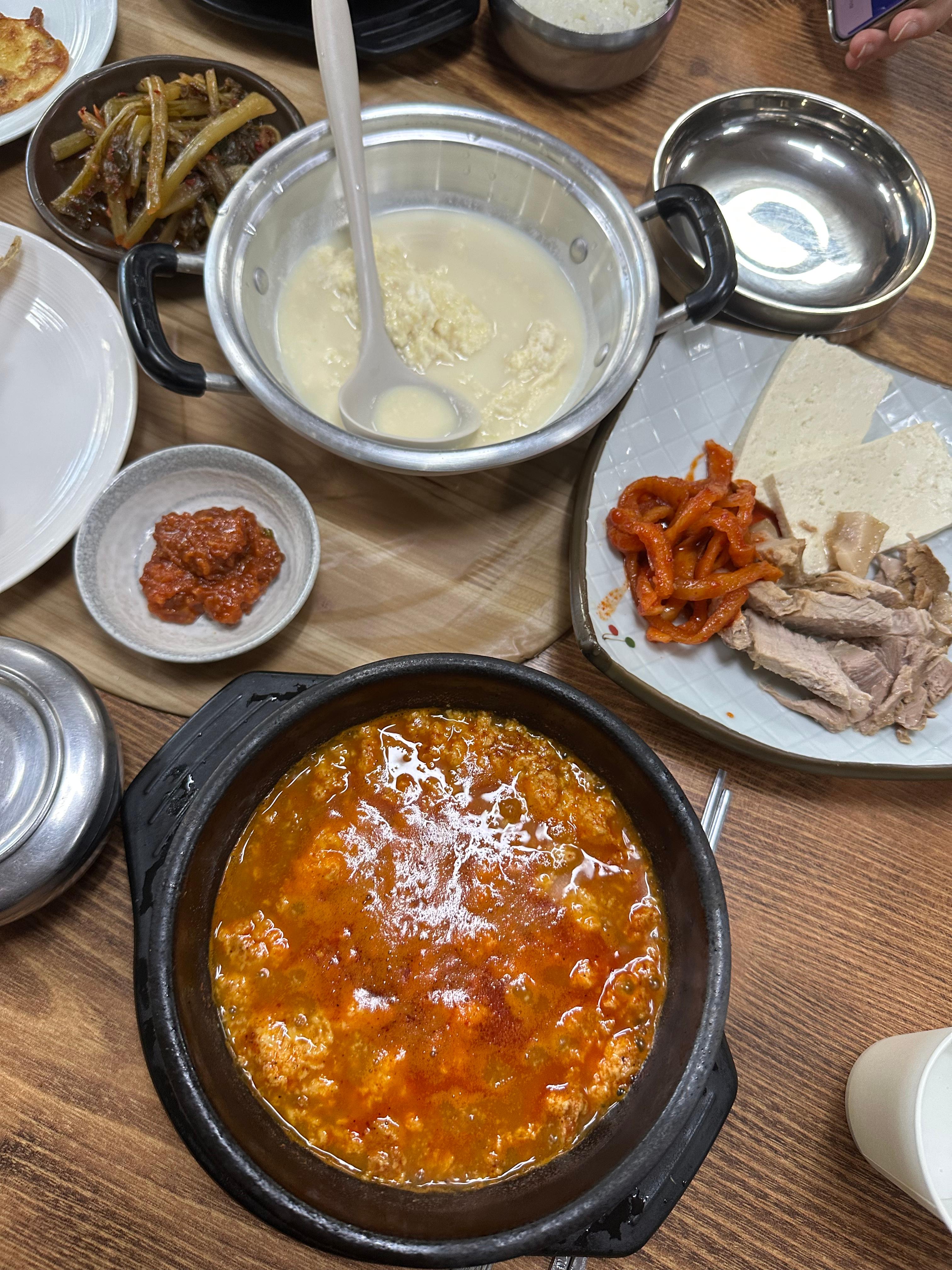 얼큰하게 끓는 해물 순두부찌개와 하얀 순두부, 삶은 돼지고기와 두부, 젓갈이 함께 차려진 조선옥 손순두부 한 상 차림