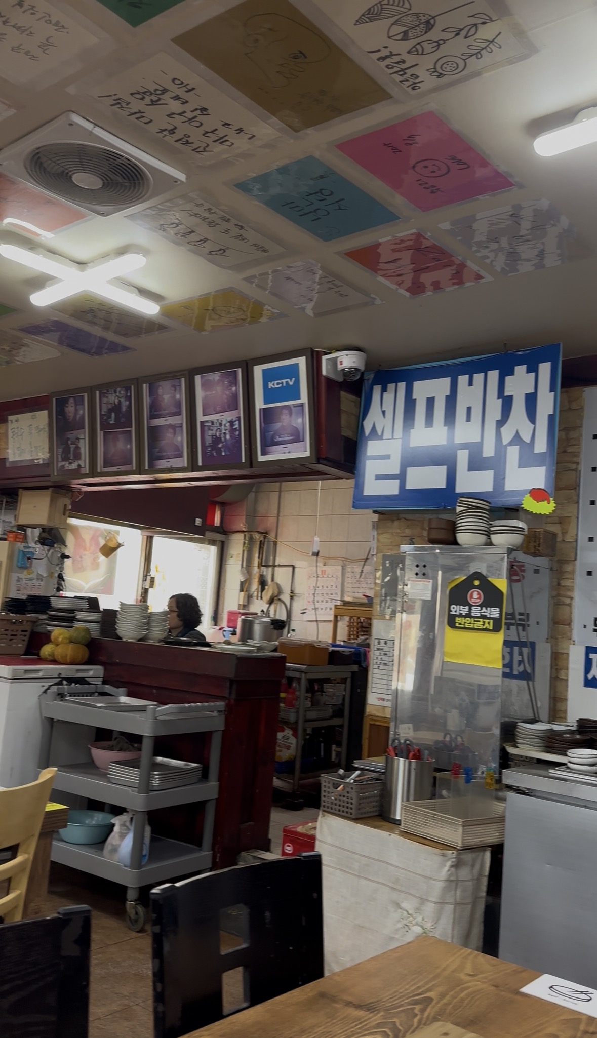 셀프 반찬 코너와 주방이 보이는 조선옥 손순두부 내부 모습, 천장에 손글씨 종이들이 붙어 있는 정겨운 분위기