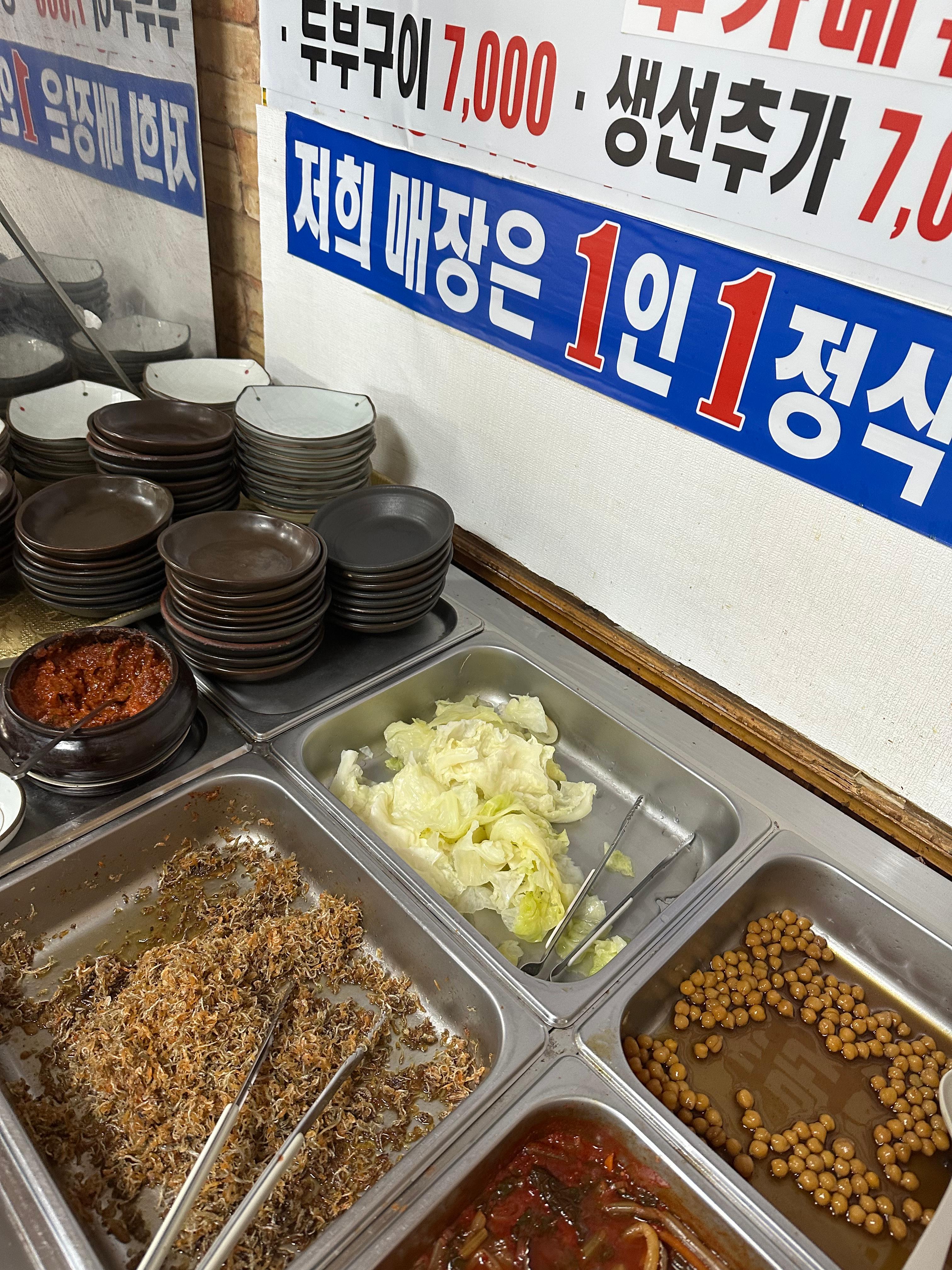 조선옥 손순두부 매장 셀프 반찬 코너에 진열된 배추, 멸치볶음, 콩조림과 김치, 그리고 ‘1인 1접시’ 안내 문구 모습