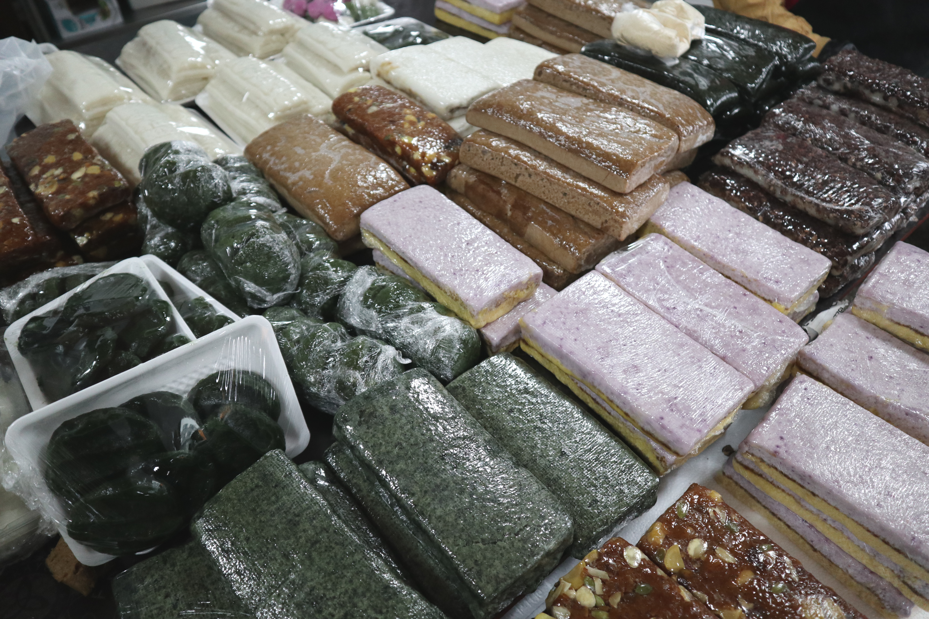 제주 동문시장 오메기떡 다양한 떡 종류 진열 모습 포장 및 구매 가능한 시장 먹거리