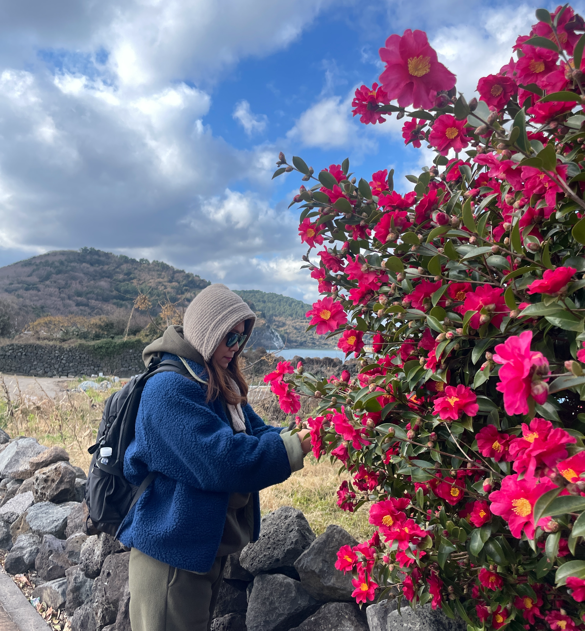 제주 올레길 18코스 해안 구간 동백꽃과 돌담 풍경