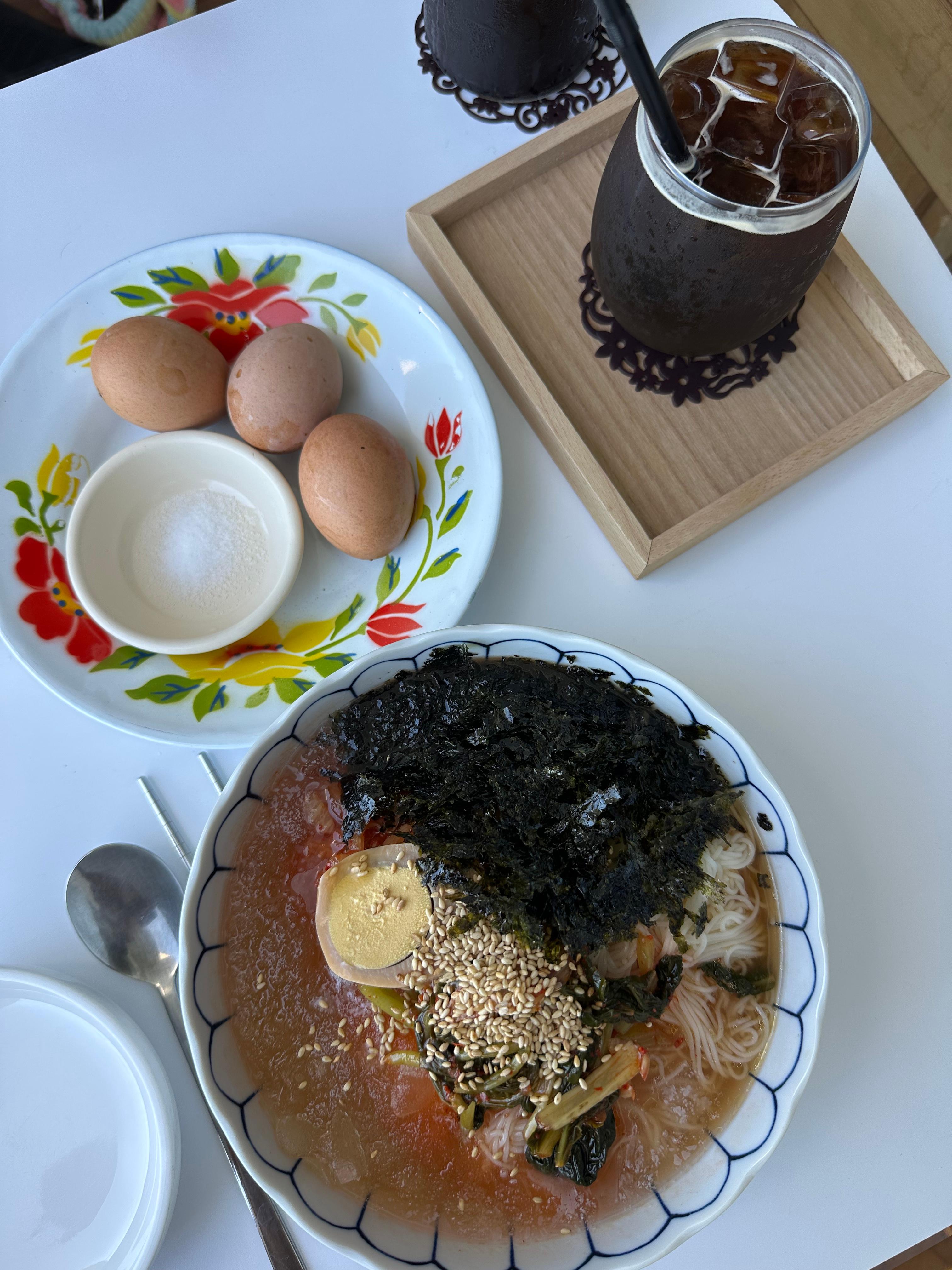 땀을 충분히 빼고 난 뒤, 바다를 바라보며 마시는 차가운 커피와 김치말이국수는 생각보다 만족도가 높다.