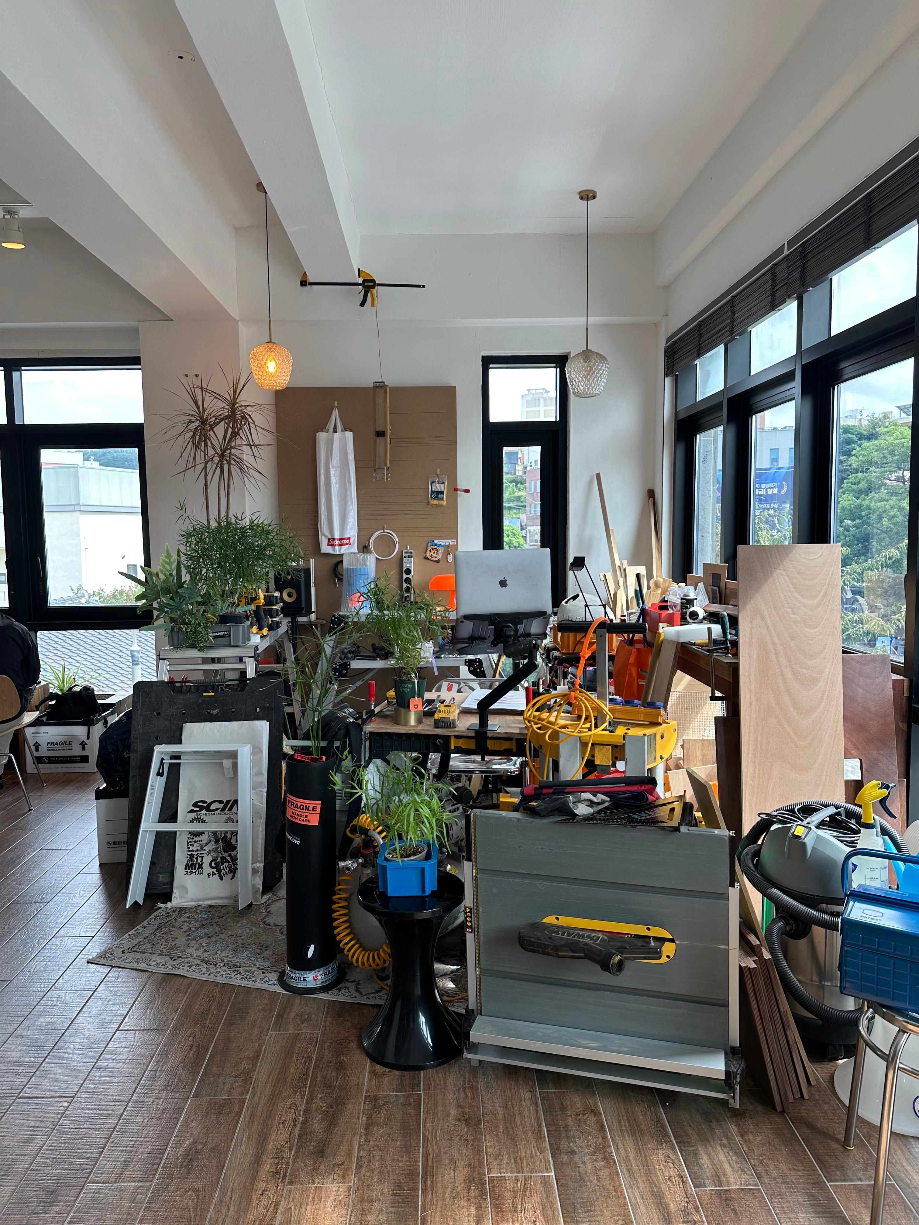 카페와 작업 공간의 경계가 모호한 구조입니다. 방문 시간은 오후 4시쯤이었고 날씨는 맑았습니다.